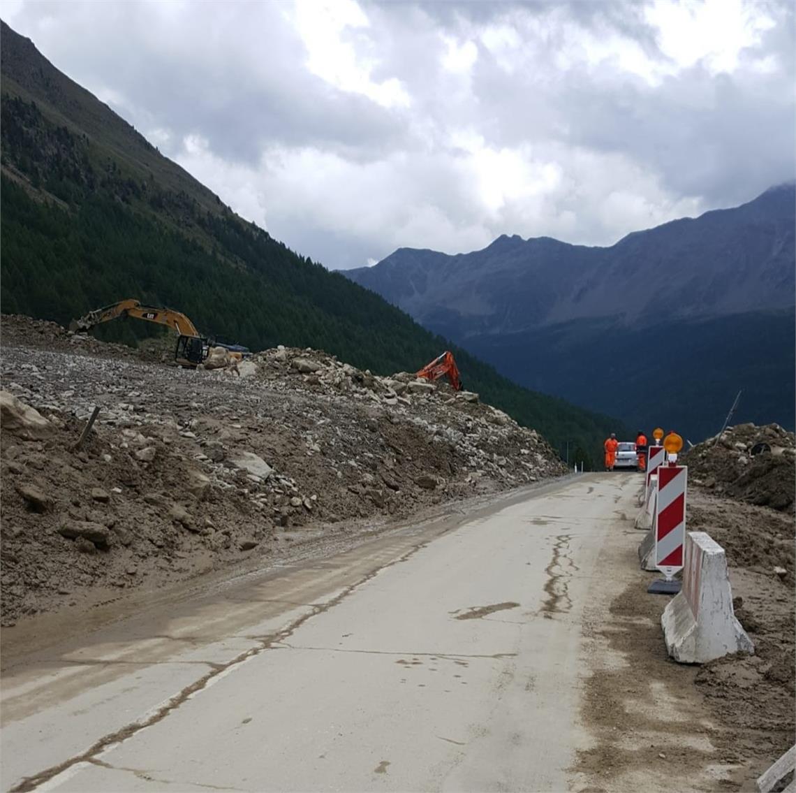 Die Mitarbeiter vom Straßendienst Vinschgau haben in den frühen Morgenstunden sofort mit den Aufräumarbeiten begonnen und den Abtransport von ungefähr 10.000 Kubikmeter Material organisiert. Nachdem die Straße von Gestein und Geröll befreit wurde, wird sie ab 18 Uhr wieder befahrbar sein, und zwar einspurig und auf Sicht bis zum Ende der Arbeiten.