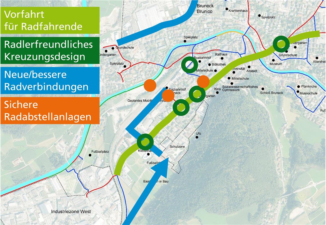 So hat Bruneck in den vergangenen Monaten viele kleine, konkrete Vorschläge für eine bessere innerstädtische Radmobilität erarbeitet. Jetzt geht es an die konkrete Umsetzung: Mit Vorfahrt der Fahrradfahrer entlang der Hauptachse, verbessertem Zustand der Radwege, neuen gezielt errichteten Radabstellanlagen, beispielsweise am neuen Mobilitätszentrum und am Graben. Ein langfristigeres Projekt hingegen soll vor allem radelnden Schülern einen sichereren Schulweg ermöglichen: Mit einer neuen Verbindung zwischen dem neuen Mobilitätszentrum und der Schulzone sowie verbessertem Kreuzungsdesign, etwa an der Kreuzung Dantestraße-Alpinistraße.