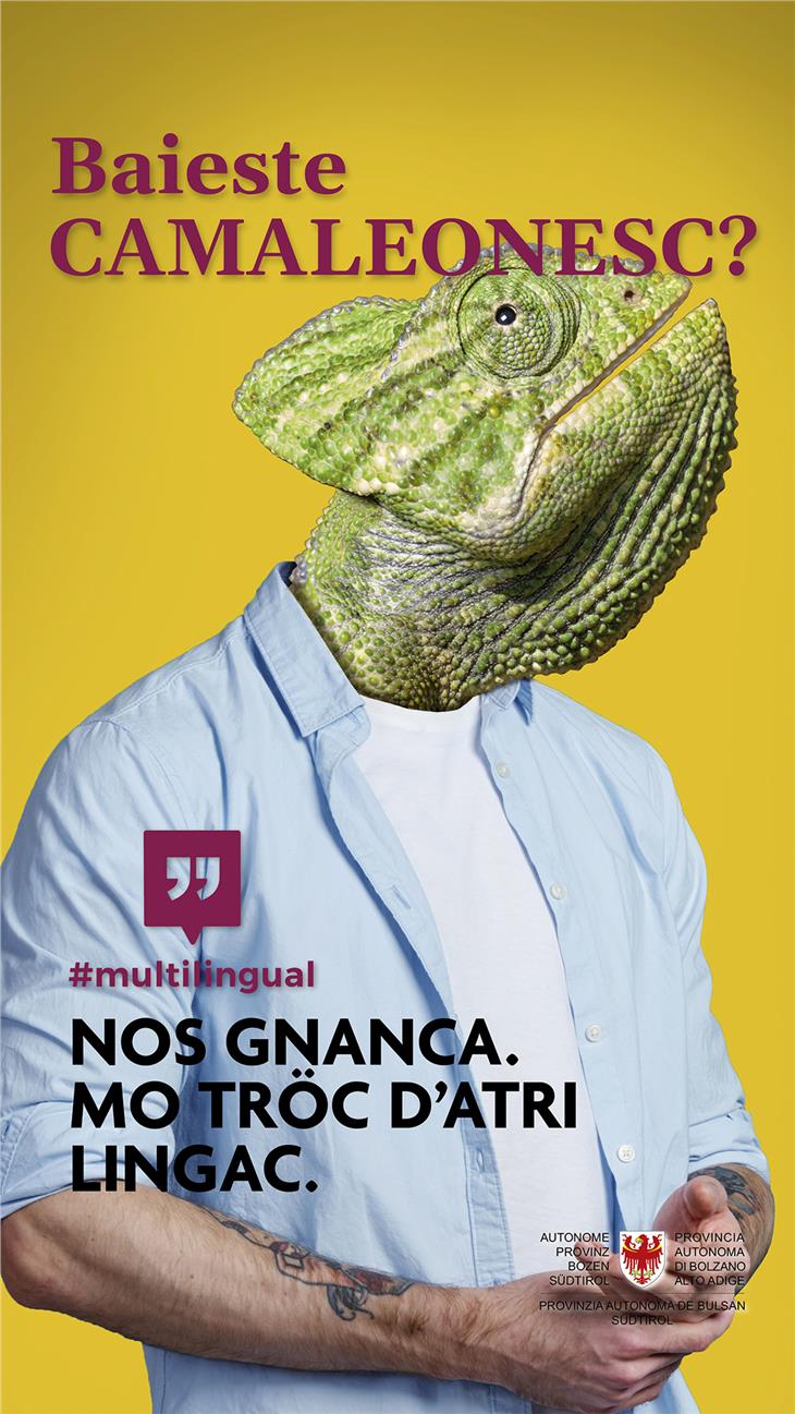 Sprichst du LUCHSISCH? Parli ZEBRESE? Baieste CAMALEONESC? Mit diesen Fragen, die sich auf einer Plakatserie wiederfinden, soll die öffentliche Aufmerksamkeit humorvoll auf das Thema der Mehrsprachigkeit gelenkt werden. Insgesamt fünf Plakatversionen liefern auch schon die Antwort: "Wir auch nicht. Aber viele andere Sprachen." Und verweisen mit der Betonung "Nie wieder sprachlos!" auf die Webseiten des Landes zum Thema Sprachen (www.provinz.bz.it/sprachen). Plakatiert wird an Südtirols Bahnhöfen und Bushaltestellen.