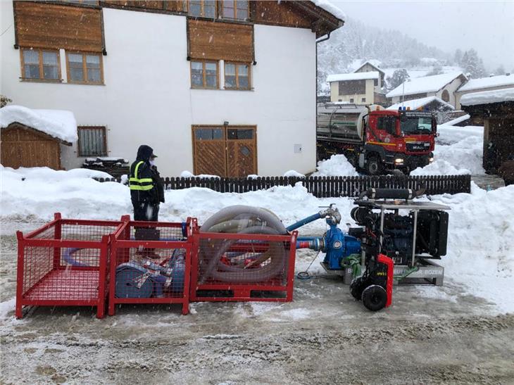 Wie berichtet, waren heute 2000 Personen in der Gemeinde Laas im Vinschgau nach der Beschädigung einer Leitung ohne Trinkwasser. In der Zwischenzeit wurde eine provisorische Lösung umgesetzt: Die Berufsfeuerwehr hat am Nachmittag mit einem Lastkraftwagen einen Trinkwassertank mit 11.000 Litern von Laas nach Tschengls gebracht und dort mit Unterstützung der Freiwilligen Feuerwehr Tschengls eine Pumpstrecke von 700 Metern verlegt; damit wird das Wasser zum Hochwasserbehälter befördert, der Tschengls und Eyrs nun mit Trinkwasser versorgt.