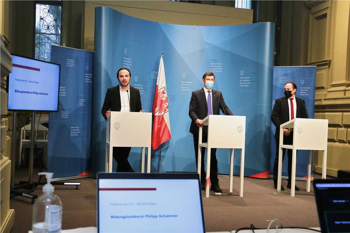 Es sei ein gemeinsames Anliegen, an den Oberschulen wieder Präsenzunterricht zu ermöglichen, betonen Achammer, Vettorato und Alfreider, die dazu die Anti-Corona-Vorkehrungen vorgestellt haben.