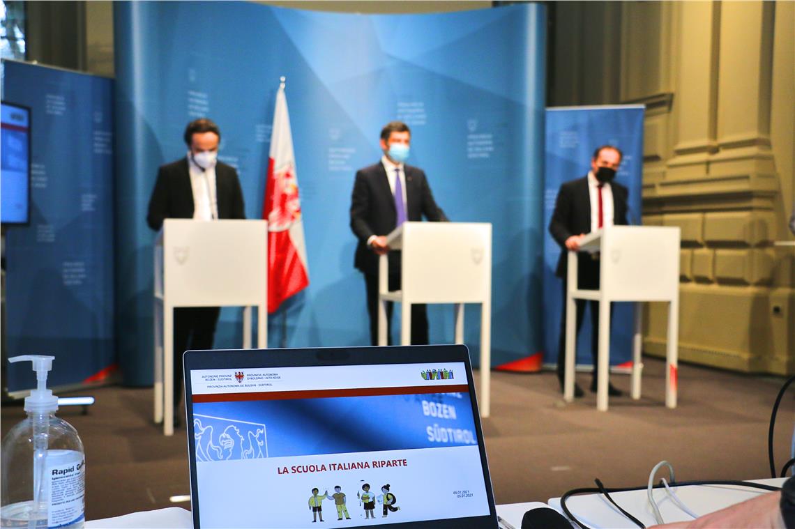 Am 7. Jänner starten auch die Oberschulen wieder mit Präsenzunterricht. Die Anti-Corona-Vorkehrungen dazu und die Änderungen im Schülertransport, etwa 400 Zusatz-Fahrten (siehe eigene Pressemitteilung), haben die Bildungslandesräte Philipp Achammer, Daniel Alfreider und Giuliano Vettorato heute (5. Jänner) in Bozen vorgestellt.