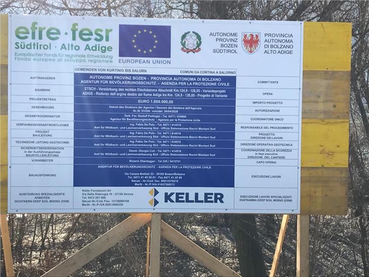 Die Mannschaft mit Vorarbeiter Roland Obertegger und Baustellenleiter Giorgio Coli dürfte die Arbeiten voraussichtlich Ende Mai abschließen. Mit diesem ersten Baulos sichert der Bautrupp einen Kilometer des Dammes. Din zweites Los von ebenfalls rund einem Kilometer Länge ist bereits für das kommende Jahr finanziert. Das Projekt ist eine der geplanten Maßnahmen zur Verringerung der Hochwassergefahr an den Ufern der Etsch, die im Jahr 2000 mit der Übertragung der Zuständigkeiten für die Etsch vom Staat auf das Land begann.