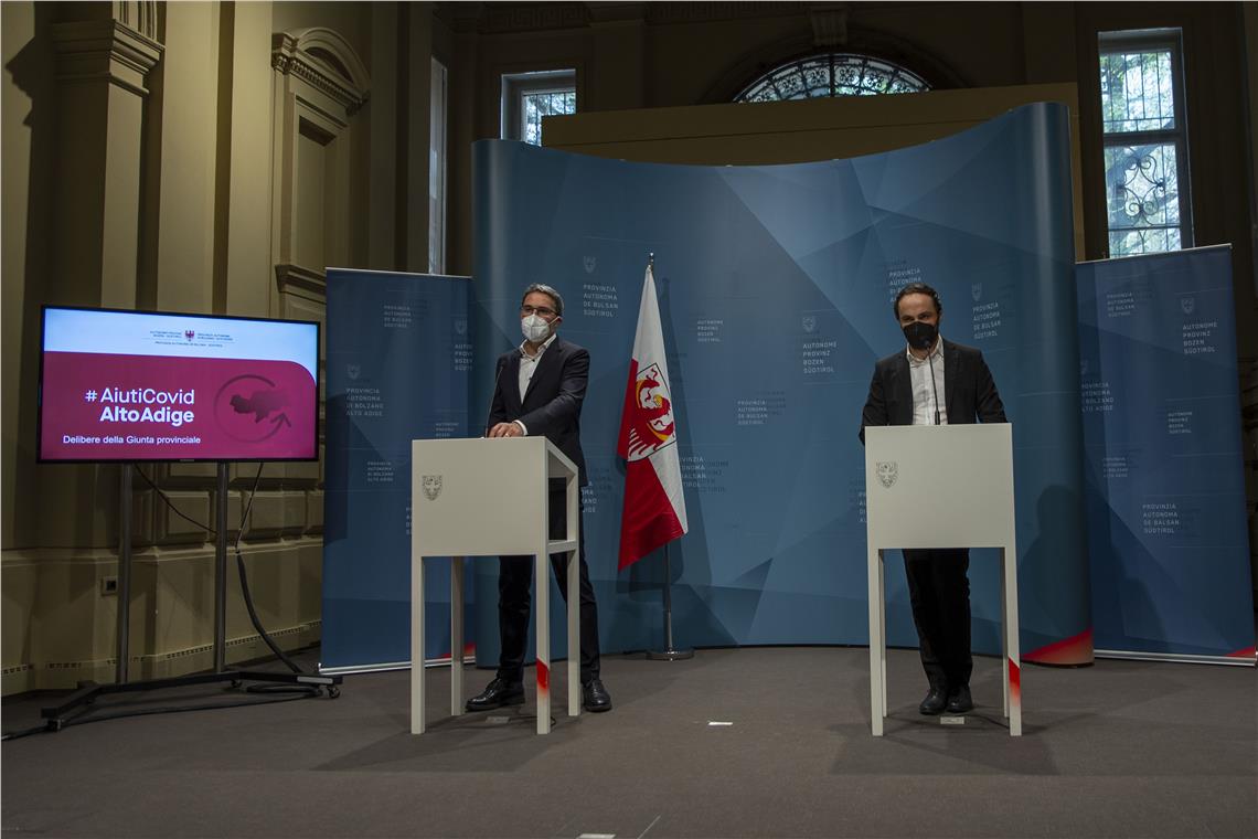 Ein Fünftel der 500 Millionen Euro, die das Land Südtirol in diesem Monat März bereitgestellt hat, um die Auswirkungen der Corona-Pandemie abzufedern, geht in Form sogenannter Verlustbeiträge an Wirtschaftstreibende. Die Landesräte Philipp Achammer und Arnold Schuler haben heute (29. März) einen gemeinsamen Beschluss vorgelegt, der die Gewährung dieser Corona-Hilfen des Landes regelt. Im Sinne des von der Landesregierung einhellig genehmigten Beschlusses können Selbstständige, Freiberufler und Unternehmen der Sektoren Handwerk, Industrie, Handel, Dienstleistungen, Gastgewerbe sowie Privatzimmervermietung schon Mitte April um die Corona-Zuschüsse in Höhe von 3000 bis 10.000 Euro ansuchen.