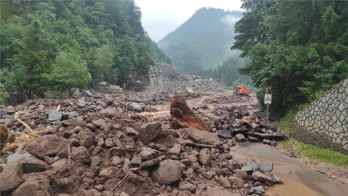 Der Straßendienst ist mit rund 30 Straßenwärtern im Einsatz, das Material wird mit Baggern und Radlagern beseitigt.