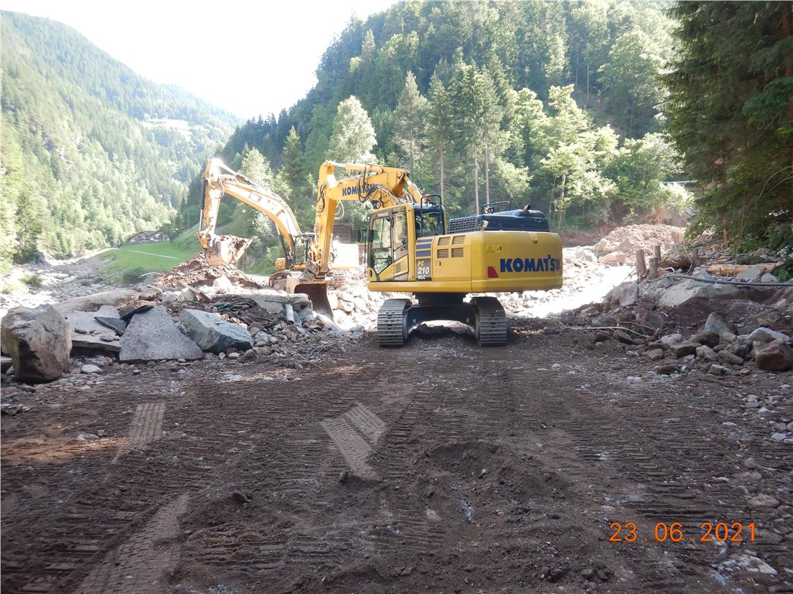 Die Mitarbeiter der Wildbachverbauung haben unverzüglich die Arbeiten aufgenommen und sind derzeit bei den beiden Schwerpunkten Tanzbach im Sarntal und Wangenerbach in Wangen am Ritten aktiv: Bei der Mündung Tanzbach-Osterbach räumen sie massive Geschiebeanlandungen weg und stellen auch die Befahrbarkeit der Zufahrten zu drei Höfen wieder her, die abgeschnitten waren; der letzte bisher abgeschnittene Engelbert-Hof ist seit gestern wieder über eine neue geschotterte Straße erreichbar. Vorarbeiter Albert Premstaller ist zudem dabei, die weggerissenen Ufermauern am Tanzbach und Osterbach wieder zu errichten und einen Unterbau zu schaffen, auf dem die Gemeinde Sarntal weiterbauen kann. Im Einsatz sind fünf Bagger und drei Lastkraftwagen mit acht Männern. Derzeit ist eine provisorische Überfahrt über einen Schotterkegel möglich, die beiden Brücken müssen erst wiedererrichtet werden. Auch in Unterwangen konnte eine zerstörte Ufermauer samt Zufahrt wiedererrichtet und die Erreichbarkeit der Gebäude gewährleistet werden. Die Arbeiten zur Wiedererrichtung der Uferschutzmauern werden anschließend im Dorf Wangen direkt fortgesetzt.