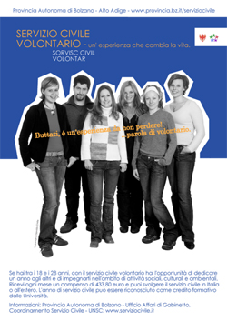 Chi desidera informarsi sul Servizio civile volontario può visitare il sito dell’Ufficio nazionale per il Servizio civile, www.serviziocivile.it o contattare il Servizio civile dell’Ufficio Affari di Gabinetto, Ripartizione provinciale Presidenza, in via