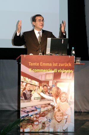 Nella relazione principale dei lavori, dedicata ai discount come pericolo per il piccolo negozio, l'esperto Wolfgang Gröll della BBE di Monaco ha individuato nei problemi generazionali la causa principale per il regredire delle piccole superfici di vendita, accompangata dai cambiamenti delle abitudini di spesa dei consumatori, dalla mancanza di professionalità dei commercianti e dal pensiero comune che associa la grande dimensione al concetto di convenienza. Per il futuro l'esperto ipotizza, tra le possibilità concrete di rilancio del piccolo negozio, l'acquisizione di servizi aggiuntivi, come la fotocopiatrice o il partyservice. Senza dimenticare due elementi importanti: la presenza di buone possibilità di parcheggio e la facilità di raggiungere il negozio. Riguardo alla composizione dei prodotti in vendita, Gröll suggerisce un reparto di freschi pari al 50-70% dell'offerta, una minore parte riservata al no-food, un assortimento tra i 2000 e i 2.500 articoli e il commercio di prodotti regionali. "Una buona politica dei prezzi, che offra gli alimenti di base come burro, farina e zucchero a prezzi contenuti, seguita da azioni di marketing, un buon servizio, periodiche novità nei prodotti e personale cordiale, potrà assicurare ai piccoli negozi abbiano buone chances di restare competitivi sul mercato", ha concluso l'ospite tedesco.