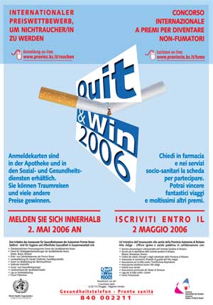 Il 22,3% della popolazione adulta italiana fuma, e oltre la metà vorrebbe smettere. Molte di queste persone ci sono riuscite da sole, molte altre si sono rivolte a personale qualificato. Quit & Win è un concorso rivolto ai fumatori che cercano un’occasione per diventare non fumatori. A livello nazionale, esso è promosso dall’ULSS 14 Chioggia con il patrocinio dell’Organizzazione Mondiale della Sanità, mentre in Alto Adige esso è curato dall’Assessorato alla Sanità, Ufficio Igiene e Salute pubblica, in collaborazione con il Servizio pneumologico interaziendale dell’Azienda sanitaria di Bolzano, il Servizio per le dipendenze delle Aziende sanitarie, i distretti socio-sanitari, l’Ordine dei medici chirurghi e degli odontoiatri della Provincia di Bolzano, l’Associazione provinciale dei Titolari di Farmacia, l’Assessorato al commercio, l’Associazione per la Lotta contro l’Insufficienza Respiratoria, la Lega per la Lotta contro i Tumori, l’Associazione Assistenza Tumori Alto Adige ed il Forum Prevenzione.