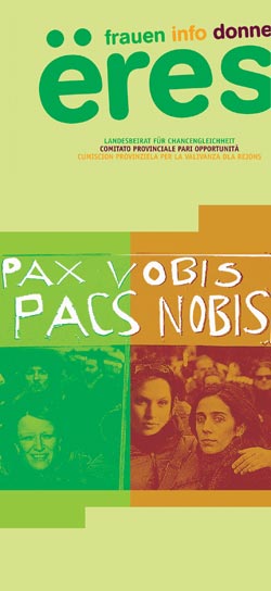 Il nuovo numero di "ëres – FrauenInfoDonne" è dedicato ai PACS. Il bollettino del Comitato Pari opportunità della Provincia raccoglie infatti diversi interventi, tra cui l’editoriale della presidente Julia Unterberger, sui Patti Civili di Solidarietà. La rivista "ëres – FrauenInfoDonne" si può ritirare gratuitamente presso il Servizio Donna, in via Crispi 3 a Bolzano (III piano).