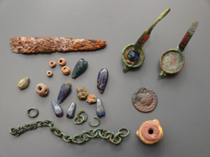 D’altra parte grazie alle lapidi con iscrizioni si conoscono i nomi di alcune persone che vivevano a Nalles durante l’epoca romana. Vi abitava ad esempio Marcus Betutius, che nella vita pubblica ricopriva una carica di prestigio. Si pone così l’interrogativo, se l’edificio portato alla luce non possa essere stato l’abitazione di un uomo facoltoso, che nel primo secolo dopo Cristo poteva permettersi di dotare la propria casa di un impianto termale privato. Accanto all’edificio di età romana è stato possibile portare alla luce anche una sepoltura. La tomba, risalente al primo Medioevo, presenta anche un corredo, orecchini e una collana di perle in pasta vitrea, donati al defunto per il suo viaggio nell’aldilà.