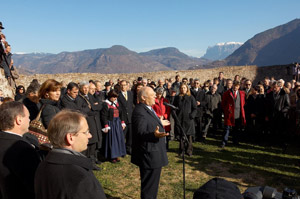 "Nel ritmo sempre più frenetico della nostra vita è necessario sapersi fermare, riflettere sulla memoria del passato. Vale per tutti i gruppi, ma in particolare è importante che una minoranza si richiami alle proprie radici", ha esordito il presidente Durnwalder aprendo il momento di commemorazione mezzo secolo dopo Castel Firmiano. Una cerimonia semplice e senza enfasi, voluta dalla Provincia per ripercorrere una tappa considerata fondamentale sul cammino dell'autonomia dell'Alto Adige.