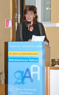 Il principale compito delle biblioteche è oggi, secondo l’assessora Sabina Kasslatter Mur, quello di preservare da un lato l’eredità culturale e di metterla a disposizione delle future generazioni e dall’altro di consentire l’accesso all’informazione ed alla conoscenza per garantire la democratizzazione e la pace sociale.