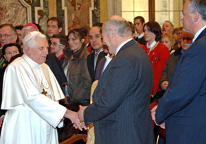 Alle 12.30 la delegazione ladina - guidata dal presidente Durnwalder, dal vescovo Wilhelm Egger, dall'assessore provinciale Florian Mussner e dal sindaco di San Martino Pepi Dejaco - ha salutato con un appaluso l'affacciarsi di papa Benedetto XVI nella sala Clementina. È iniziato così l'atto principale della "missione" a Roma di circa 250 altoatesini che presenziano oggi all'accenzione in piazza San Pietro dell'albero di Natale donato dai 5 comuni della val Badia al Vaticano e al pontefice.