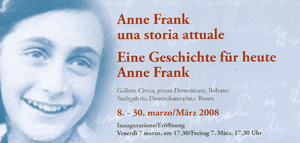 La mostra bilingue “Anne Frank una storia attuale - Eine Geschichte für heute Anne Frank” ideata e realizzata dalla Anne Frank House di Amsterdam, distribuita in Italia in esclusiva da Pro Forma, storia & memoria, è proposta a Bolzano dal Lab*doc storia/Geschichte, laboratorio di storia, dalla rivista “STORIA E” dell’Intendenza Scolastica Italiana, Ufficio Processi educativi della Provincia Autonoma di Bolzano, in collaborazione con l’Assessorato alla Cultura del Comune di Bolzano – Ufficio Servizi Museali e Storico-Artistici a 70 anni dalla promulgazione in Italia delle “Leggi razziali” del 1938.