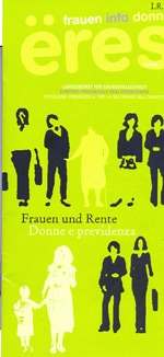 Il nuovo numero di “ëres-frauen info donne” edito dal Comitato provinciale per le pari opportunità si sofferma su due argomenti. Il tema principale è “Donne e previdenza”; in un articolo si evidenzia come le donne eprcepiscano pensioni inferiori di oltre il 40 per cento rispetto a quelle degli uomini o semplicemente quelle di reversibilità. A tal riguardo sono riassunti in pratici schemi gli elementi che portano al calcolo della pensione e viene fornito un indirizzo Internet dove con un gioco on line si può visualizzare gli importi pensionistici espletando un impiego a tempo pieno o part-time. In un altro articolo si parla delle cause che sottendono alla reazione negativa delle donne italiane alla proposta del ministro Brunetta di portare anche a livello nazionale il limite di età pensionabile nel pubblico impiego a 65 anni.