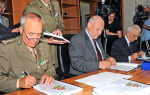 Il presidente Durnwalder firma l'accordo con il generale Resce e il direttore generale dell'Agenzia del demanio Prato (Foto USP/Pertl)