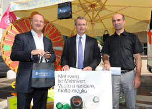 Il lancio della campagna per indurre all'impiego del vuoto a rendere (da sin. a ds.) Luigi Minach, direttore dell'APPA, l'ass.Michl Laimer e Walter Andreaus direttore del CTCU (Foto: USP/A.Pertl)