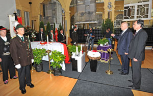 Il presidente Durnwalder e l'assessore Theiner davanti al feretro di Magnago (Foto: LPA/Pertl)