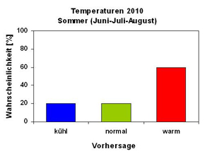 I modelli metereologici indicano, secondo il Servizio metereologico provinciale, che l'estate 2010, al via il 1. giugno, dovrebbe essere un'estate piuttosto calda con temperature sopra la media nel mese di agosto. Il maggio 2010 che si conclude oggi è stato un mese mediamente caldo e piovoso. Dal 4. giugno temperature in aumento con punte di 30 gradi.