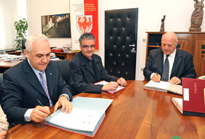 Il presidente Durnwalder e il direttore dell'Agenzia del demanio Tancredi firmano il verbale di consegna dei beni alla Provincia. Al centro il sindaco di Curon Noggler (Foto USP/Pertl)