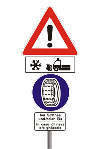 A indicare l'obbligo di attrezzatura invernale in caso di neve o ghiaccio, due cartelli: il primo è il classico segnale di pericolo che sormonta l'indicazione della possibile presenza di mezzi sgombraneve. "In questo caso la distanza minima di sicurezza dal mezzo in movimento deve essere di 20 metri - ha proseguito Montagner - se questa indicazione non viene rispettata si corre il rischio di vedersi ritirare 3 punti dalla patente". Il secondo cartello, invece, è quello blu con all'interno il disegno del pneumatico invernale. "Ciò significa che da quel momento in avanti - ha sottolineato il direttore del Servizio strade - in caso di neve o ghiaccio si potrà circolare solo con l'attrezzatura invernale: chi non rispetta quest'obbligo rischia una multa di 78 euro, e gli può essere impedita la prosecuzione della marcia".
