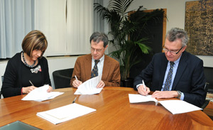 La firma del protocollo d'intesa da parte della vice-preside Liliana Dozza, del preside Franz Comploj e dell'assessore Roberto Bizzo