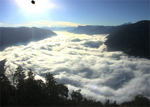 Nebbie alte nella valle dell'Adige il 15 gennaio; nel pomeriggio grazie al vento Föhn da nord si sono dileguate e le temperature hanno raggiunto fino a 16 gradi Celsius a Merano.