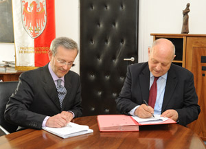 A Palazzo Widmann è stato siglato ieri sera (16 maggio), con la firma del presidente della Giunta provinciale Luis Durnwalder e del presidente Michl Ebner, il patto di stabilità tra la Provincia e la Camera di Commercio, secondo lo schema predisposto dalle Ripartizioni provinciali Finanze e Enti locali. La Camera di commercio si impegna a contenere le spese mediante la razionalizzazione della struttura organizzativa, la promozione di soluzioni di e-government e l’eventuale esternalizzazione di servizi non ritenuti strategici. Il sistema di calcolo del patto prevede che a fine 2011 la Camera di commercio dovrà raggiungere un saldo di esercizio di 1,773 milioni di euro, circa 250mila in più del 2010. La spesa sostenuta per consulenti ed esperti viene ridotta del 5% rispetto al 2010. Sono invece esclusi dal patto di stabilità i costi sostenuti per le aziende speciali EOS, l'organizzazione che promuove l'export, e IPSE, l'istituto che promuove lo sviluppo economico. Non ricadono nel patto anche le spese di investimento per aumentare il fondo in dotazione delle aziende speciali e le spese connesse con le funzioni delegate.