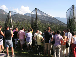 Le reti antigrandine combattono i parassiti; è uno degli esiti delle inconsuete e creative prove sperimentali che i tecnici della sezione agricoltura biologica del Centro di Sperimentazione Laimburg hanno presentato ieri, 25 agosto 2011.
