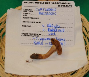 “Cortinarius maculosus” è il nome del raro fungo da ieri esposto alla 47° mostra micologica “I funghi dell’Alto Adige” al Museo di Scienze Naturali a Bolzano. Ritrovato dai soci dell’Associazione micologica “Bresadola” nei pressi di Monticolo, si tratta del primo esemplare di questa specie attestato in Alto Adige.