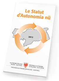Sino all'anno scorso la pubblicazione "Le Statut d'Autonomia nü" conteneva la versione in lingua ladina dell'Accordo di Parigi del 1946 e del secondo Statuto di Autonomia del 1972. Nel volume rivisitato e ampliato disponibile a partire da oggi (15 febbraio), ci sono invece due importanti novità: i passaggi in lingua ladina della Costituzione italiana riguardanti la popolazione altoatesina, e l'elenco aggiornato a novembre 2011 delle norme di attuazione. "Lo Statuto di Autonomia - sottolinea Florian Mussner, assessore ladino in Giunta provinciale - costituisce la base della pacifica convivenza dei tre gruppi linguistici in Alto Adige. Con la nuova versione di questo volume si mette a disposizione della popolazione di lingua ladina uno strumento importante per conoscere al meglio le fondamenta del nostro sistema politico e legislativo".