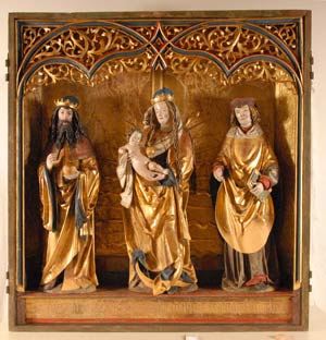 Si tratta di statue lignee della scuola tardogotica dello scultore svevo Ivo Strigel (1431-1516) che raffigurano Maria col Bambino tra i patroni diocesani di Coira Luzius e Florinus. Le tre figure fanno parte di un altare originario probabilmente del Canton Grigioni giunto nell'Alta Val Venosta probabilmente in concomitanza con la Riforma. L'altare risale al 1514; le cifre dell'anno sono riportate sul retro dell'altare stesso. I dipinti sul retro altare e sulle pale sono del pittore Hans Goldschmid, attivo presso la botega di Strigel a Memmingen (D).