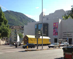 Il padiglione giallo che promuove la candidatura dell’Alto Adige con Venezia e il Nordest a Capitale europea della cultura 2019 staziona davanti al teatro comunale di Bolzano per tutta la durata del Festival Bolzano Danza. Ieri sera l’apertura al pubblico del singolare museo mobile.