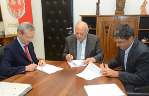 La firma tra Provincia, Comuni, Camera di commercio con i presidenti Durnwalder, Kompatscher e Ebner (Foto Pertl)
