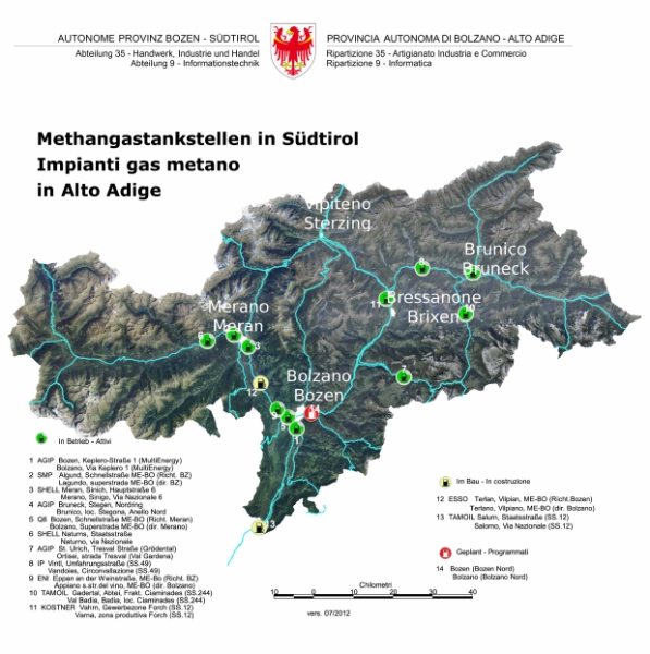Alleghiamo pdf dell'opuscolo e la cartina dei distributori di metano operanti (ed in costruzione) in Alto Adige.