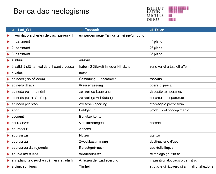 Bilancio di un anno di lavoro del gruppo di esperti composto da rappresentanti dell'istituto culturale ladino Micurà de Rü e dell'Ufficio provinciale questioni linguistiche. che accanto alle tematiche della grammatica e dell'ortografia gli esperti studiano lo sviluppo della lingua ladina e il suo aggiornamento: nella banca dati del gruppo di esperti sono stati già inseriti, nel primo anno di attività, 1500 neologismi in ladino con i corrispettivi italiano e tedesco.