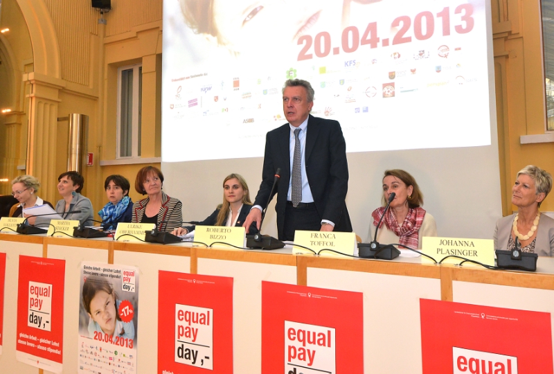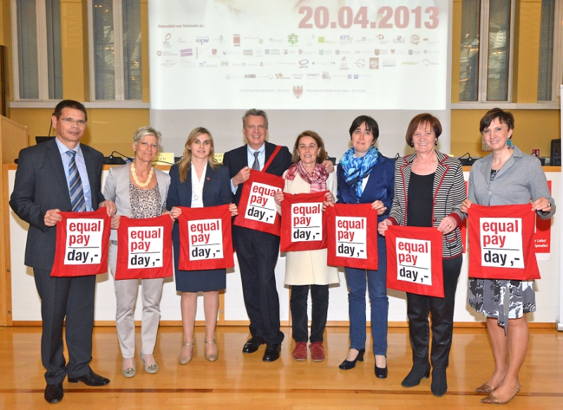 Le iniziative poste in essere da oltre 55 organizzazioni in occasione della giornata d'azione per una pari retribuzione per pari lavoro "Equal pay day 2013" che ricorre il 20 aprile sono state illustrate a Palazzo Widmann a Bolzano questa mattina, mercoledì 17 aprile 2013, dall'assessore provinciale alle finanze, lavoro e pari opportunità Roberto Bizzo assieme alla presidente e vicepresidente della Commissione provinciale per le pari opportunità, Ulrike Oberhammer e Franca Toffol.