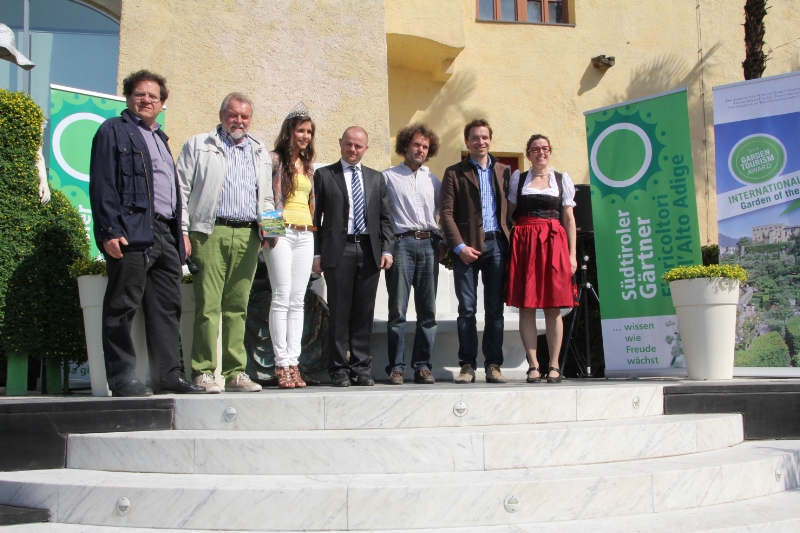 Nella foto (da sinistra): vicepresidente dell'Associazione Floricoltori Altoatesini, Hansjörg Auer, presidente dell'Associazione Floricoltori Altoatesini, Valtl Raffeiner, Miss Alto Adige, Manuela Ramoser, direttore dei Giardini di Castel Trauttmansdorff, Daniel Bedin, membro del direttivo dell'Associazione Floricoltori Altoatesini Heinz Luther, Robert Psenner dell'impresa Psenner, l'autrice della Guida ai Giardini Trauttmansdorff, Karin Ortler.