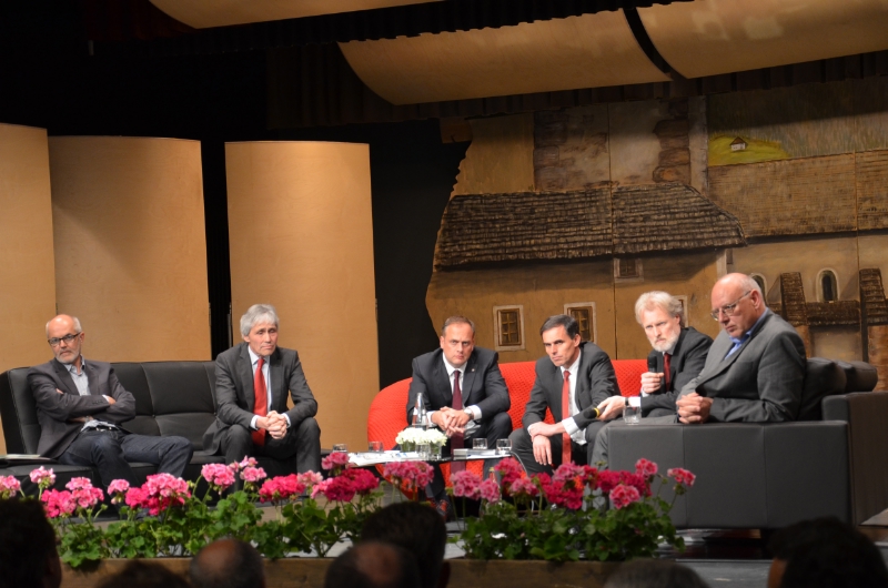 Incontro pubblico a San Candido con (da sin.) il primario Thomas Lanthaler, il direttore generale AS Andreas Fabi, il sindaco Werner Tschurtschenthaler, l'assessore Theiner, il moderatore Eberhard Daum e il direttore sanitario Mayr