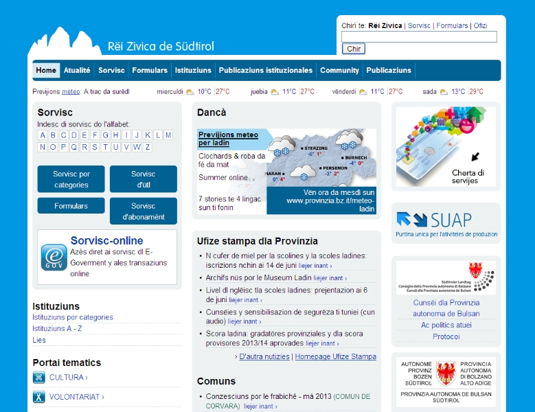 Oltre che sul proprio computer, la Rete Civica in ladino è consultabile anche dal proprio smartphone, con la versione mobile www.provinzia.bz.it/m/la che offre tra le altre cose le news dell'Ufficio stampa, la situazione di viabilità e pericolo valanghe e le previsioni meteo. Proprio la pagina meteo in lingua ladina (www.provinzia.bz.it/meteo-ladin) sta facendo registrare ottimi risultati con 12mila visite e una punta di 2.600 click nel mese di maggio. Grazie al Servizio Comunicazione, inoltre, vi è la possibilità di seguire le più importanti notizie riguardanti l'attività dell'amministrazione provinciale seguendo i profili presenti su Facebook (Jonta dla Provinzia de Bulsan) e su Twitter (https://twitter.com/ProvinziaBZ).