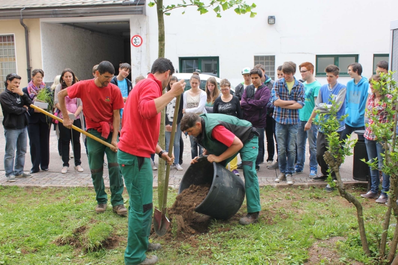 I giardinieri di Trauttmansdorff piantano il ginkgo nel cortile dell’Istituto tecnico economico in lingua tedesca H. Kunter a Bolzano.