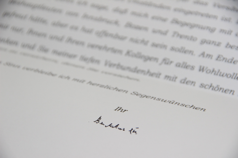 Sarà sicuramente sorpreso di ricevere una lettera da me...: sin dall'incipit della missiva inviata al presidente della Provincia Luis Durnwalder l'autore era consapevole della reazione che avrebbe suscitato. Del resto, non è da tutti i giorni ricevere posta da un Papa emerito. Nella sua lettera Benedetto XVI. esprime al presidente Durnwalder il rammarico per il mancato incontro con i tre Governatori dell'Euregio.