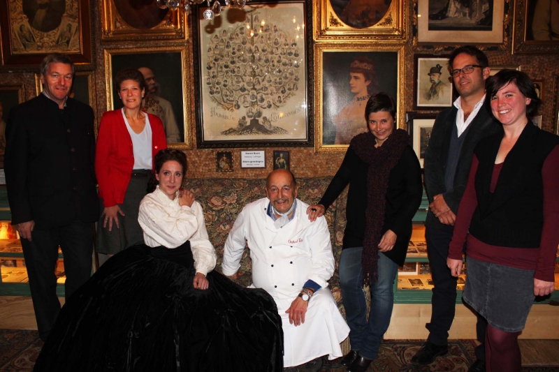 A cena da ”Onkel Taa“ (da sinistra a destra): Florian Ellmenreich (Belvita Hotel Adria), Astrid Kellner (Regio Augsburg Tourismus GmbH), Sabine Rossegger (interprete di Sissi), Karl Platino (Onkel Taa), Heike Platter