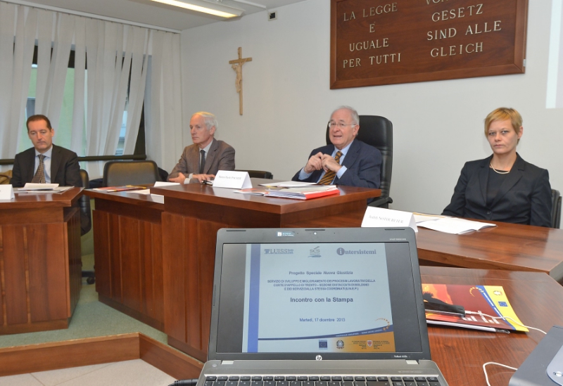È stato presentato questa mattina nel corso di una conferenza stampa il "Progetto Speciale Nuova Giustizia"- Servizio di Sviluppo e Miglioramento dei Processi Lavorativi della Corte d'Appello di Trento - Sezione Distaccata di Bolzano e dei Servizi dalla stessa coordinati (UNEP) alla presenza di Judith Notdurfter, direttrice dell'Ufficio FSE, per la Corte d'Appello - Sezione di Bolzano, del presidente di sezione preposto Renzo Paolo Pacher, del presidente di sezione Johann Pichler e dei progettisti della LUISS - Guido Carli.