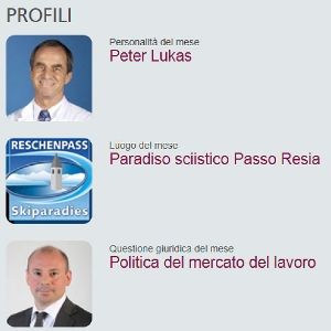La pagina web dell'Euregio Tirolo-Alto Adige-Trentino, all'indirizzo http://www.europaregion.info/ , ogni mese approfondisce nella rubrica "Profili" alcune tematiche con valenza transfrontaliera con dei video in lingua italiana e tedesca, le lingue principali dell'Euregio. Questo mese i tre nuovi profili riguardano rispettivamente il Paradiso sciistico Passo Resia in Alta Val Venosta, il tema d'attualità sul mercato del lavoro e il personaggio Peter Lukas, direttore della Clinica Universitaria di Radioterapia e Radio-Oncologia dell'Università Medica di Innsbruck.