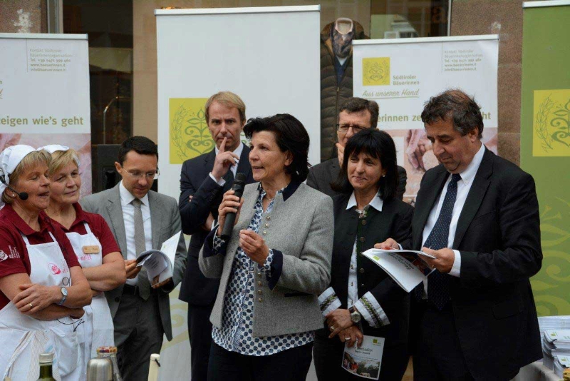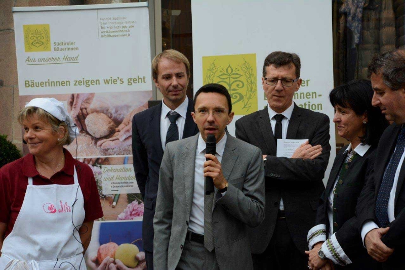 da dx: il sindaco di BZ L.Spagnolli, la presidente Associazione Contadine H.Neuhauser Erschbamer, l'intendente scolastico tedesco P.Höllrigl (dietro), il direttore del Dipartimento agricoltura K.Unterweger (dietro), l'assessore provinciale Tommasini e le due contadine.