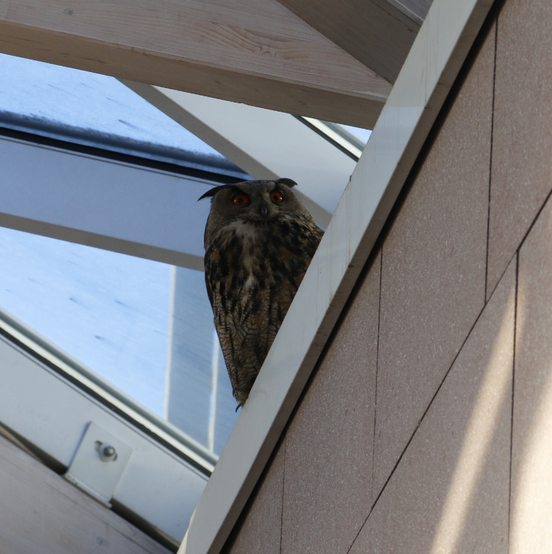 L'animale, un gufo reale maschio (bubo bubo), è stato notato di prima mattina da un impiegato ai piani alti del palazzo provinciale 2 di fronte alla stazione ferroviaria di Bolzano, dove probabilmente era finito nel corso della notte: la copertura in vetro dell'edificio non ha permesso all'esemplare di riacquistare la libertà, aumentando ovviamente la sua confusione.