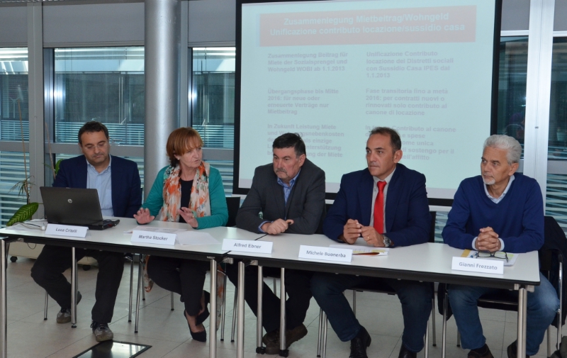 Nel 2016, dopo un periodo transitorio di tre anni, sarà completata l'unificazione del sussidio casa e del contributo al canone di locazione. Ci sarà quindi una sola prestazione di sostegno per il pagamento dell'affitto. Nel quadro di una conferenza stampa l'assessora Martha Stocker, il direttore della Ripartizione Politiche sociali Luca Critelli e i rappresentanti sindacali Alfred Ebner (CGIL-AGB), Gianni Frezzato (UIL-SGK) e Michele Buonerba (SGB-CISL) hanno fatto il punto della situazione presentando le novità recentemente introdotte.