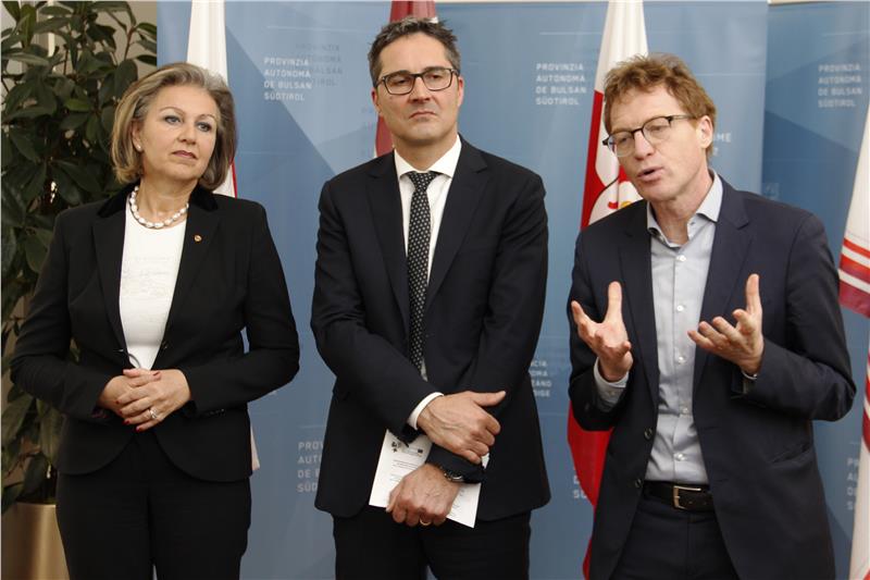 Cooperazione transfrontaliera, marketing territoriale, sinergie per sfruttare al meglio i finanziamenti europei. Questi i temi al centro dell'incontro di questa mattina (27 febbraio) a Palazzo Widmann fra il presidente della Provincia di Bolzano, nonché assesessore all'economia, Arno Kompatscher, e i due assessori all'economia di Tirolo e Trentino, Patrizia Zoller-Frischauf e Alessando Olivi. "La collaborazione è già collaudata, come ad esempio nella formazione degli apprendisti, ma vogliamo intensificarla nei settori dove è necessario fare massa critica", ha esordito Kompatscher. Il vertice di Bolzano ha portato un primo importante risultato concreto: a partire da febbraio, infatti, le tre agenzie che si occupano di promuovere i siti economici dei territori dell'Euregio, ovvero Standortagentur Tirol, IDM Alto Adige e Trentino Sviluppo, accorperanno le proprie offerte attuali e promuoveranno la nascita di un vero e proprio sito economico Euregio.